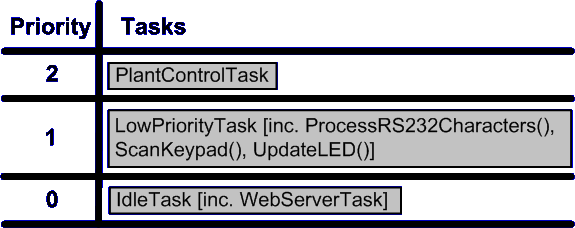 プラントコントロールタスクは、最高優先順位タスクとして、それが必要とする時いつでも処理時間を割り当てられる。 もし必要であるなら、それは低いあるいは中間の優先度タスクをプリエンプト(事前に制止)するでしょう。 これらのアプリケーションタスクがブロック状態になるとアイドル・タスクは実行される。 アイドル・タスクはプロセッサをパワーセーブモードへ置くオプションを持っています。 |